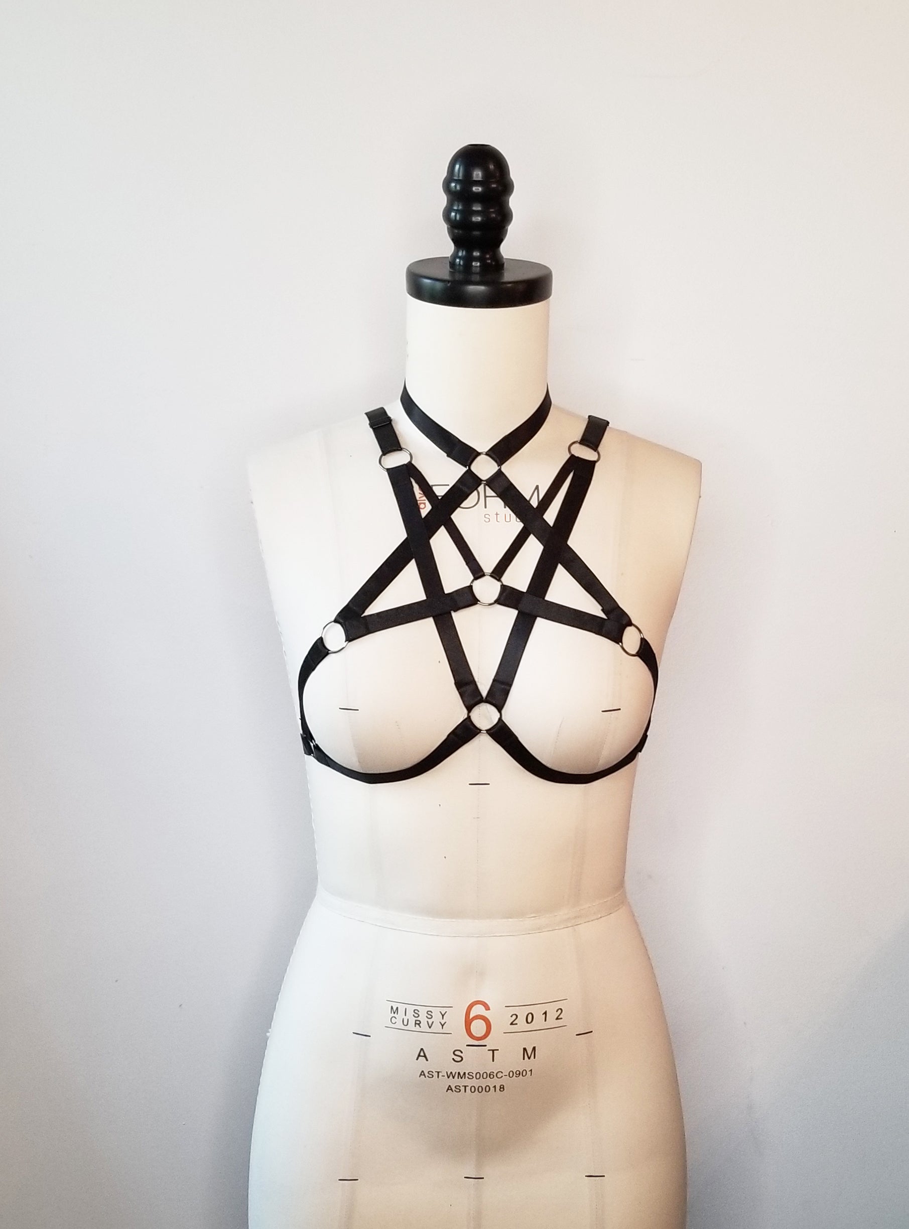 Introducing the Illuminaugty: made from luxurious high quality satin elastic, our Illuminaughty cage bra harkens to the mysterious MasonicĀ square and compass. This item is free sized with adjustable straps in the arm, neck and across the chest.Ā