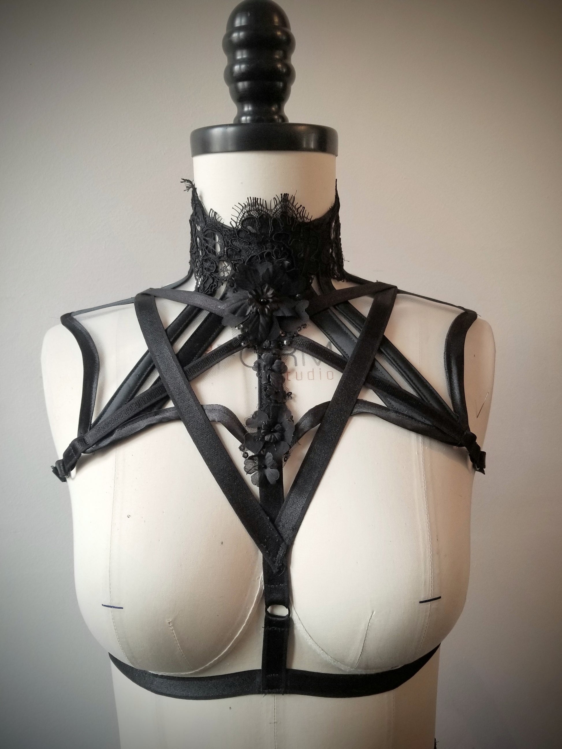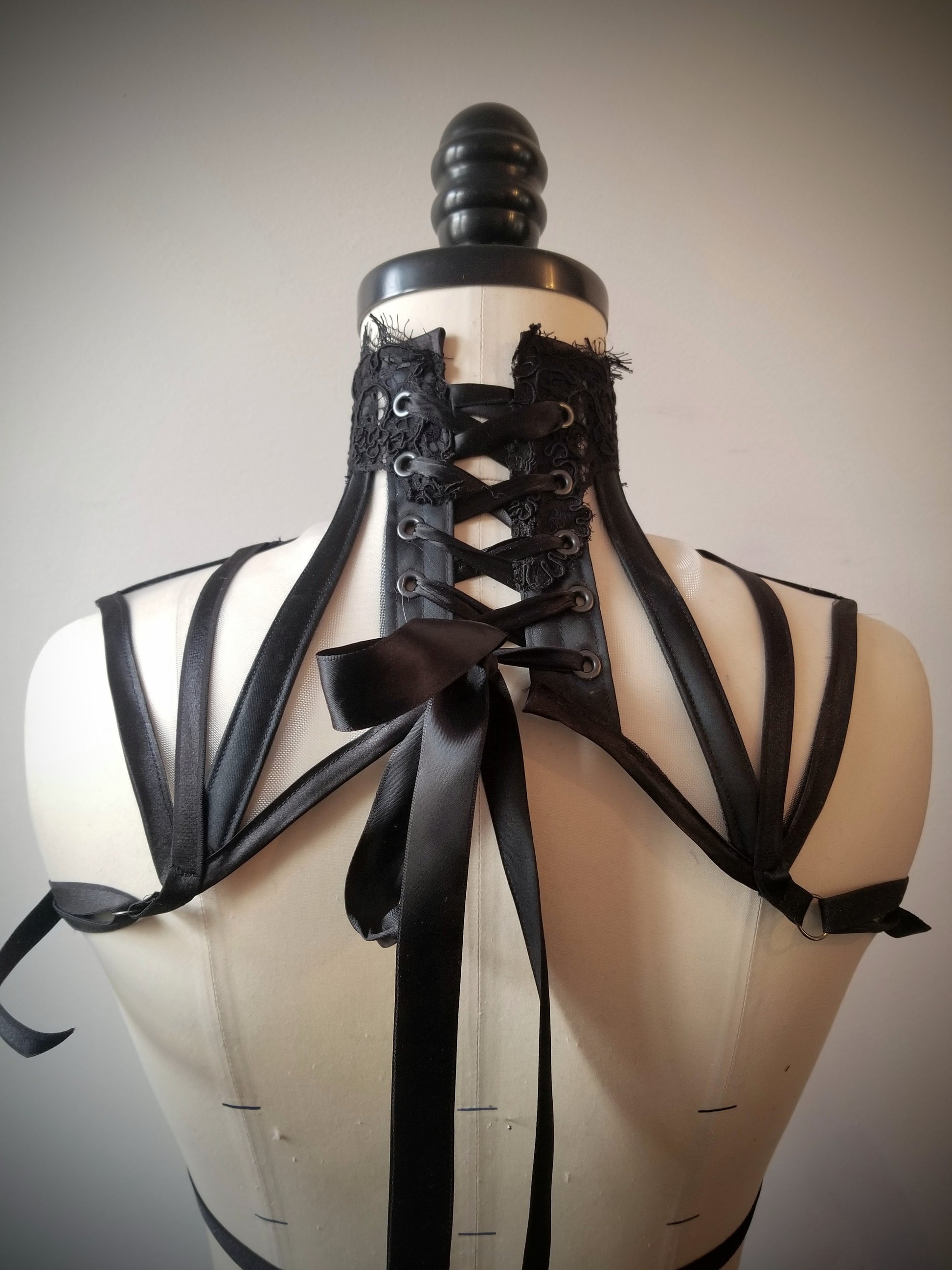 A strong, yet delicate corsetry mesh frame, supported with spiral and sprung steel boning, this posture collar integrates a fetish-y luxurious soft satin elastic ribcage harness, with complicated strapping to produce a pentagram shape. Can be ordered either plain, or embellished.